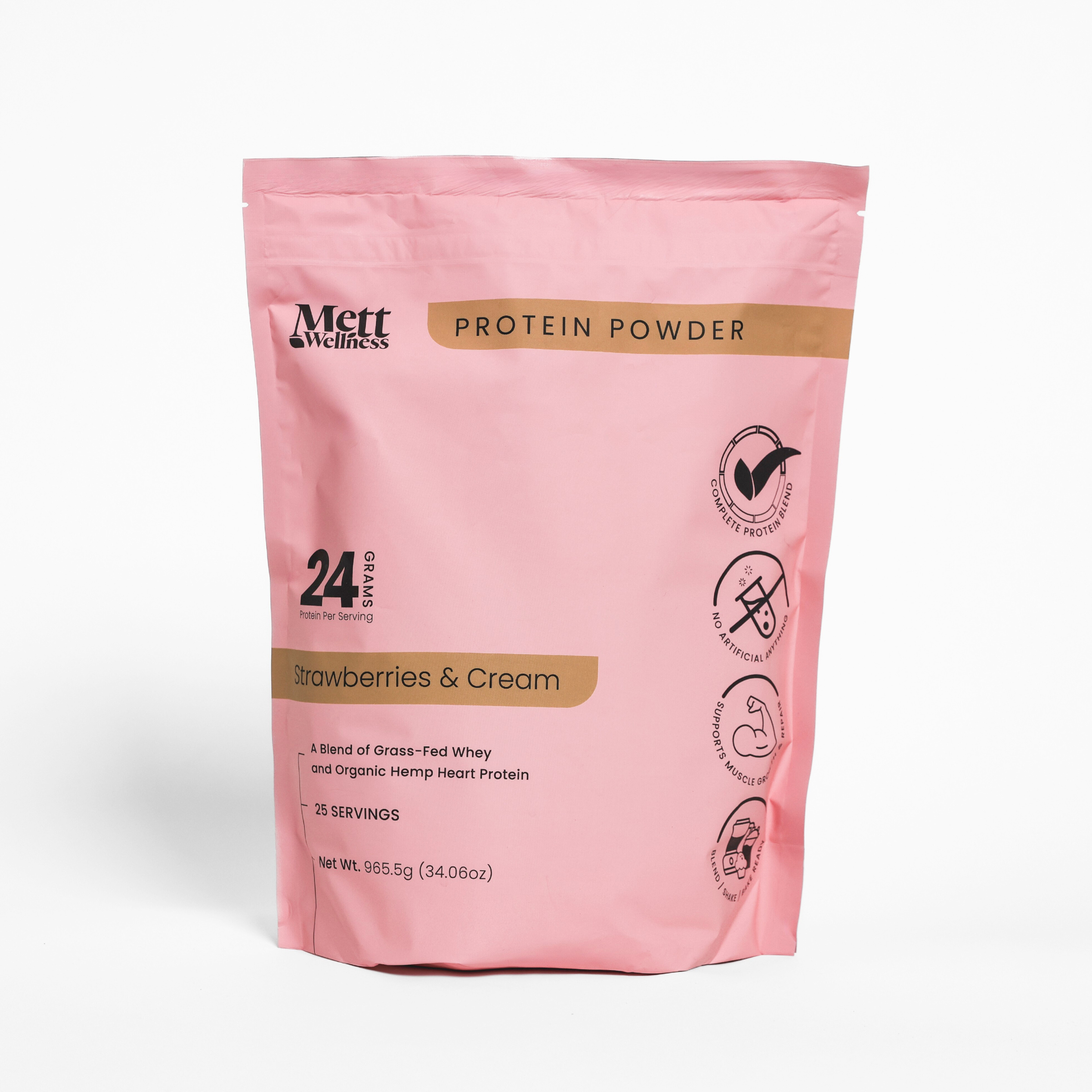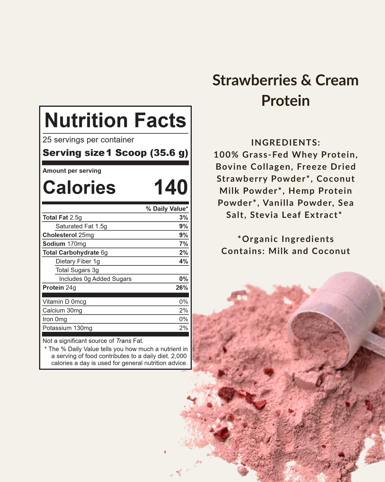 PRE-ORDER Our delicious blend of Australian Grass Fed Whey + Hemp Heart Protein. Blended with natural Bovine Collagen and organic Strawberries with a touch of cream. All 9 essential amino acids, Omegas 3 & 6, and essential plant-based protein.